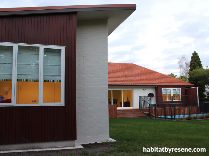 Brick painted in Resene Half Parchment and timber panels in Resene Cedar from Resene’s Waterborne Woodsman Exterior Timber Stains help marry the contemporary addition to the original house. The soffit is Resene Nero.