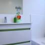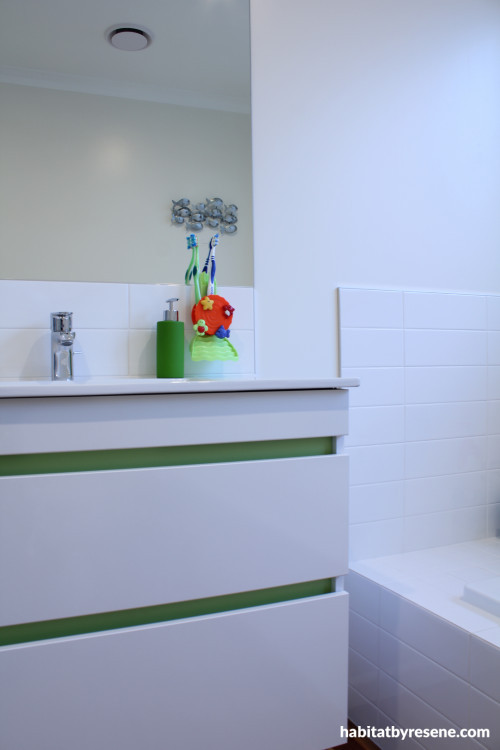 Green detailing in the bathroom echoes colours used elsewhere in the house.