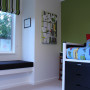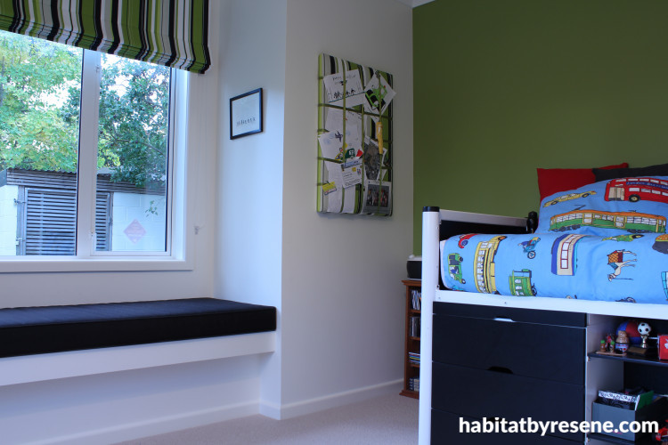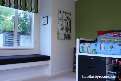 Resene Kombi was chosen as an enduring colour to take a young boy through the years and to set the scene for a bold striped window fabric at the window and a colourful bed cover.