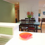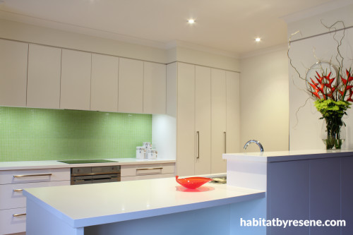 The kitchen is crisp in green and white, with mosaic tiles echoing the Resene Jigsaw wall of the adjoining dining room.