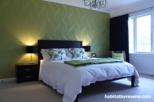 The master bedroom features a Blendworth wallpaper called Yo Yo. The striking yellow/green background colour and metallic paisley print balances the Resene Half Villa White walls in the room.