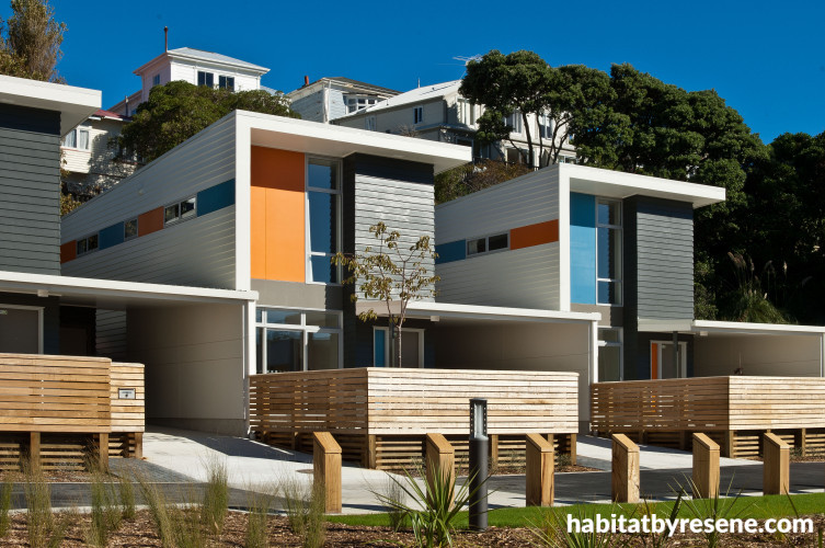 The Wellington City Council Regent Park Development won the Resene Total Colour Maestro Nightingale and Residential Exterior Awards for Designgroup Stapleton Elliott. The colour palette is extensive and carefully curated unit by unit, featuring Resene DNA, Resene White Pointer, Resene Clockwork Orange, Resene Wedgewood, Resene Whizz Bang, Resene Wazzup, Resene Pulse, Resene Funk, Resene Koromiko, Resene Vermont, Resene April Sun, Resene Koru, Resene Double Gravel and Resene Triple Friar Grey.
