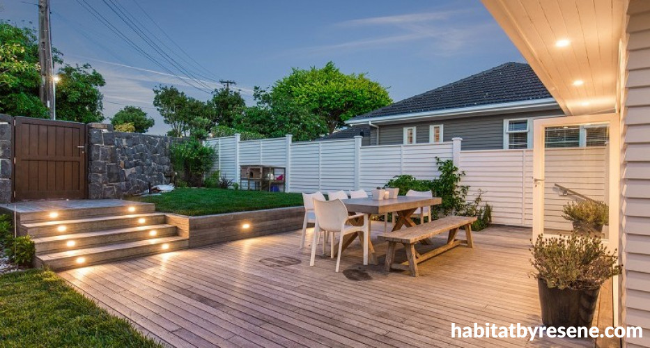 The back garden was extensively renovated to build large decks and a stone wall. The exterior is painted in Resene Half Surrender and the fence is painted in Resene Alabaster.