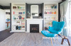 The media room was created as an adult retreat for busy parents Annabel and Simon. The built in bookcase is finished in Resene Half Milk White and is set against a wall in Resene Tuna.