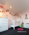 Daughter Mia lives in a world of fairies and princesses so her bedroom walls painted in soft pink Resene Pot Pourri. Another bedroom is given a more subtle look with Resene Quarter Fuscous Grey, while a spare bedroom features broad horizontal stripes of Resene Smalt Blue and Resene Half Milk White on the wall behind the bed.