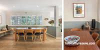 The walls and ceiling of the dining area are in Resene Pearl Lusta with tongue-in-groove panelling in Resene Duck Egg Blue.