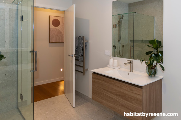 While the colour scheme might seem neutral, the timber accents, whether it be the kitchen cabinets, bathroom vanity, floorboards or shelving and the indoor plants provide pops of colour that draw the eye. The neutrality also means the homeowners can personalise the space and make it their own.