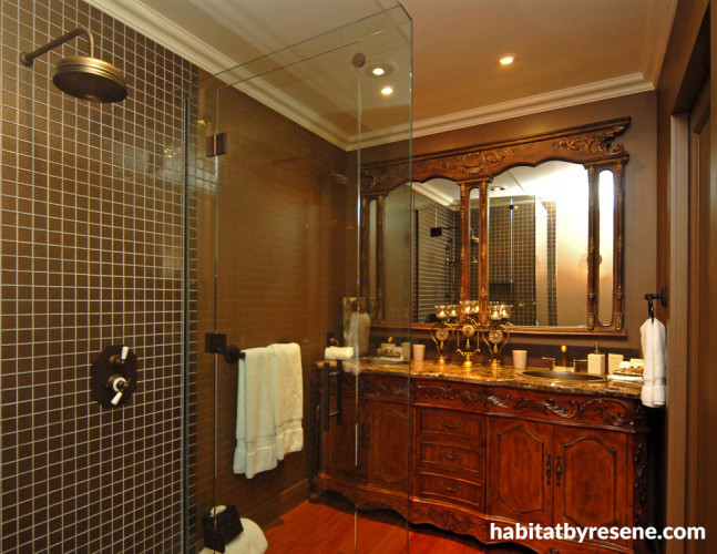 There’s nothing like metallic to add glamour. Resene Spark is the perfect complement to the majestic antique vanity with its shapely marble top. The bathroom is part of the Parkhill lodge near Napier; Wendy Giltrap, now of The Interior Design Group, helped with the design.