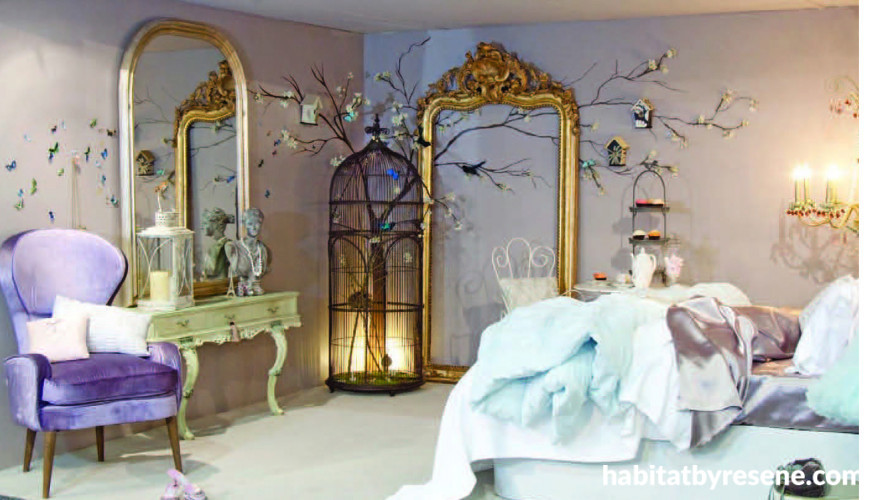 Interior designer Philippa Hunt created this gorgeously, glamorously girlie room for a home show setting, using Resene Quarter Buffalo on the walls to complement the subtle powder blues, pale dove grey and white of the bed linen. The ceiling, painted in Resene Eighth Buffalo, gently cocoons the room without being overly oppressive, while the tree mural is painted in Resene Ebony Clay and Resene Tuna.