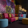 Oversized ottomans and gilt-framed artworks and mirrors,
