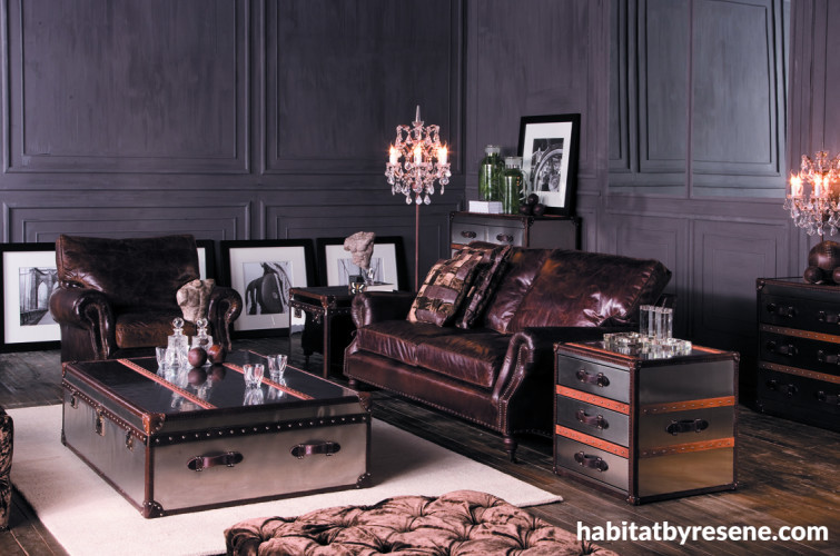 A delicious mix of textures – glossy trunks, burnished leather, lustrous velvet – is used with a restrained palette of browns and greys in this masculine take on a glamour room. All products are from Halo.