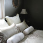 Lots of squishy pillows in silver white brocade create a feeling of simple luxury against walls in Resene Soya Bean. Thanks to the Carran family.