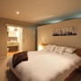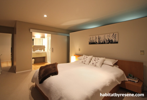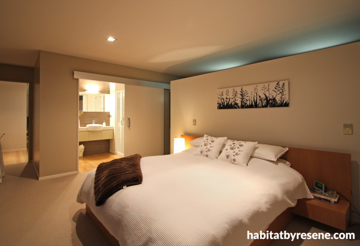 The master bedroom, painted in Resene Blanc and Resene Soapstone, is located away from the other bedrooms and has views to Kapiti Island and the South Island.