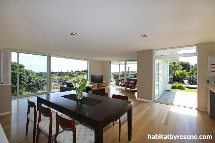 The open-plan living/dining/kitchen area was one of the family's favourite spaces in the home, with its coastal views and indoor-outdoor flow.