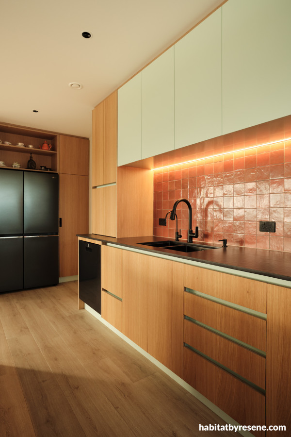 Noor says the kitchen is her favourite room in the house due to the combination of Resene Edgewater with the burst of contrast from an orange tile backsplash and natural plywood finishes.