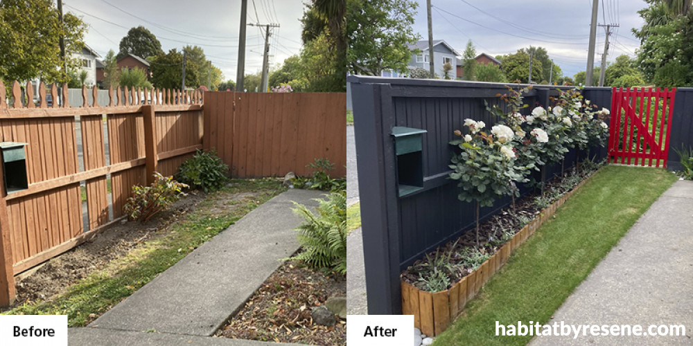 When Sally moved into her new home two years ago, she decided the front gate needed spicing up. “I wanted a dark colour, but I didn’t want it to be completely black. I went for charcoal Resene Double Foundry as it has a slight blue tinge,” she says. “Then I was reading habitat magazine and was inspired by an article showing a bright red gate in Resene Poppy in the middle of a green hedge. I decided on Resene Jalapeno, and I painted this on a second fence at right angles to the front fence, which has given a complete contrast. It’s made the entrance of the house much more interesting.”
