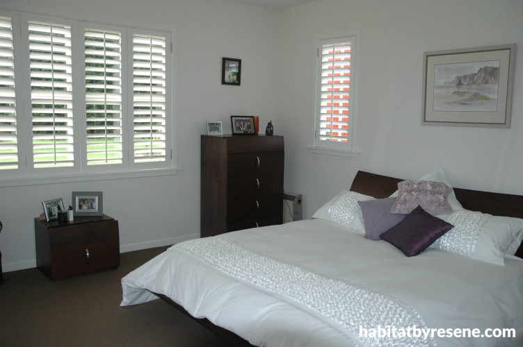 Monica chose dark wood furniture and bright Resene Wan White from the Karen Walker paints collection for the walls of her own bedroom.