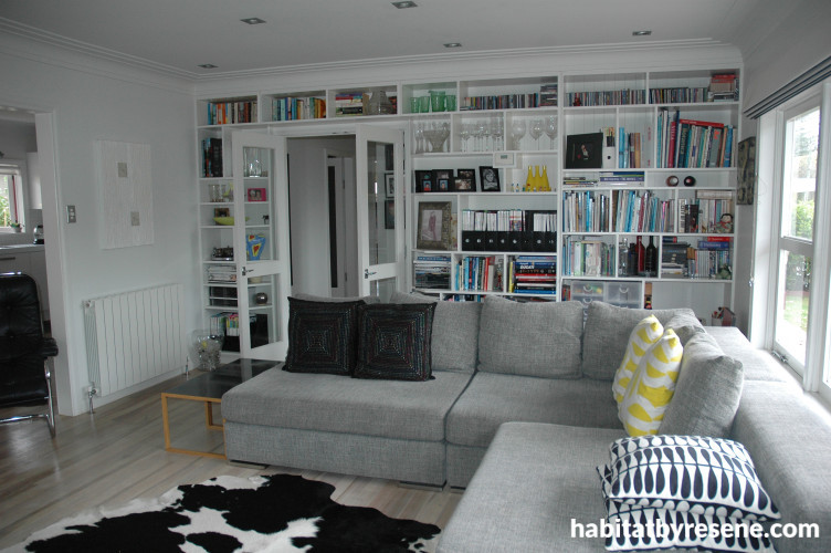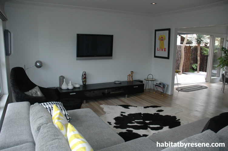 The black “egg” chair and foot stool are from the 1970s. Debra bought them second-hand. “I restored and recovered them to give them a more modern look.” The black, yellow and red handpainted glass vase is a recent addition bought in Melbourne. “I was attracted to the colours and sheer beauty of the piece.” The round side table in the corner is a kitsch piece from the 1950s which Debra found on TradeMe and uses frequently: “This would have to be one of the most practical furniture purchases I have ever made.”