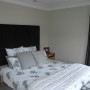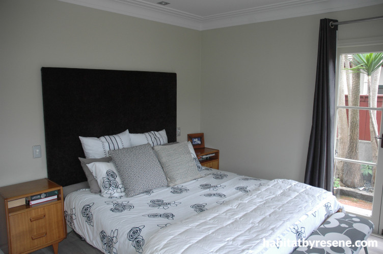 The black, white and grey theme continues in the master bedroom, but the white walls have been replaced by a softer shade - Resene Sisal.