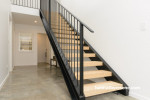 The entrance. I love that when you step in through the glass front door, you are immediately introduced to the main design elements inside the home – the concrete floor and the steel and plywood staircase, all framed by those beautiful Resene Alabaster walls.