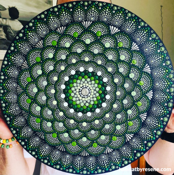 Lynsey’s nature inspired ‘Forest’ mandala is painted in Resene Aluminium from the Resene FX Metallic range, Resene Ottoman, Resene Caper, Resene Amulet, Resene Fringy Flower, Resene Green Leaf, Resene Crusoe Green, Resene Palm Leaf, Resene Spanish Green and Resene Black Rock.