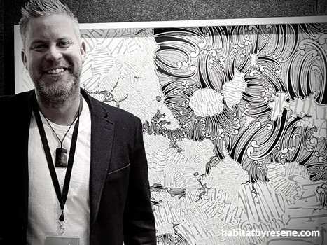Although his art is covered with vibrant and pulsating shades, Shane’s personal favourites are two classic and timeless neutrals – Resene Alabaster, which he says is the perfect canvas for beautiful things, and Resene Element, a deep, moody colour that’s also featured in his 8Bit Tui’s wings.