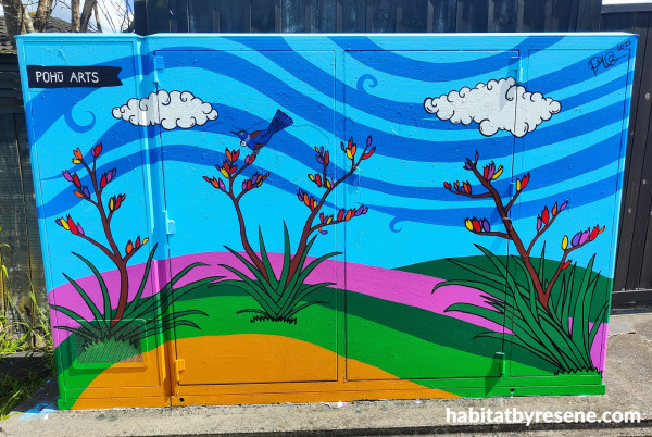 Pohū Arts has brought their colourful, community-driven murals to several locations around Auckland, including Sandringham Community Centre, Manukau Bike Hub, Mt Roskill Bike Hub, Manurewa Bike Hub and Chorus boxes in Manurewa and Manukau.