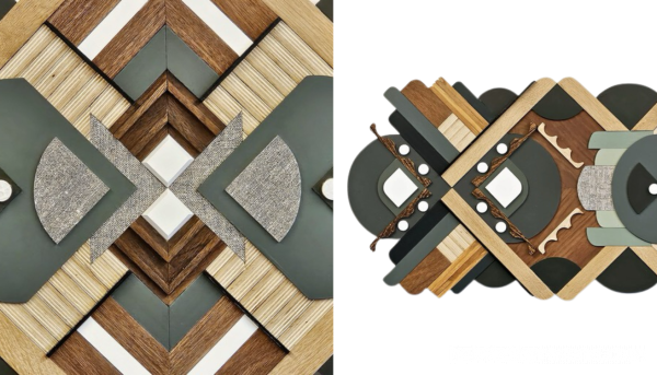 Looking carefully at this piece shows the details and skills that go into Glen’s work. The various textures and shapes create one-of-a-kind artwork and feature Resene Possessed, Resene Jurassic, Resene Woodsmoke, Resene Mangrove, Resene Marshland, Resene Field Day, Resene Half Rivergum and Resene Blackjack. There are also subtle hints of texture through Resene Wallpaper Collection 25746.
