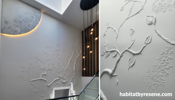 This striking Moon and Tree art, designed by Ladan from Artfull Studio, adds a unique 3D feature and focal point to this space. For this design, Ladan used a mix of Resene Quarter Thorndon Cream, Resene Thorndon Cream, Resene Triple Thorndon Cream, Resene White, Resene Quarter Grey Chateau, Resene Mountain Mist and Resene Shuttle Grey.