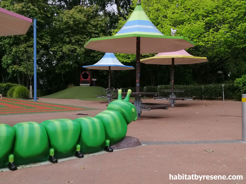 Caterpillars at The Garden’s playground come to life with Resene Japanese Laurel and Resene Fuel Yellow.