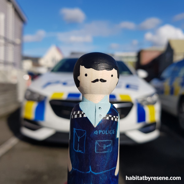 A miniature policeman is painted in Resene Black, Resene Quarter Rakaia, Resene Anakiwa and Resene Elvis.
