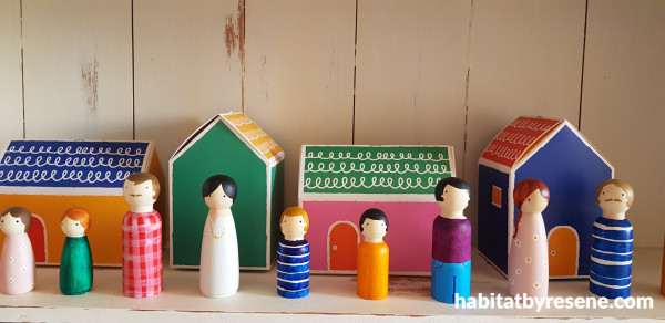 A set of Folk dolls, ready to take part in some imaginary play to guide children’s learning. These dolls are painted in (from left) Resene Paper Doll, Resene Kaitoke Green, Resene Poppy, Resene Quarter Rakaia, Resene Elvis, Resene Juicy, Resene Anakiwa and Resene Belladonna.