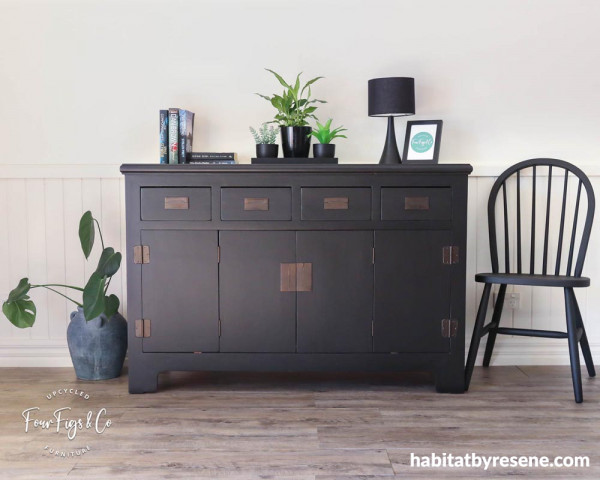 “For this buffet, we used Karen Walker Chalk Colour in Resene Black. The chair next to it was painted in Resene SpaceCote Flat tinted to Resene Black.”