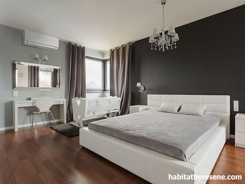 Great placement and a handy colour selection from white, silver and black means that heat pumps can enhance your decor, not hinder it. Get the look for this bedroom with walls in Resene Silver Chalice and Resene Nocturnal, and a Mitsubishi Electric Designer Series Heat Pump in Matte Silver.