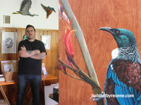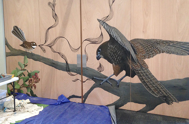 As well as creating sky high murals, Joe also paints New Zealand native birds onto woodgrain, and is an artist in residence at the Anglican Parish of the Oroua.