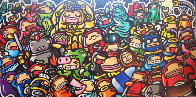 Born in Japan but living in New Zealand, Jun’s colourful works draw on influences from pop art, traditional Japanese art, kanji (Chinese characters used in Japanese writing).