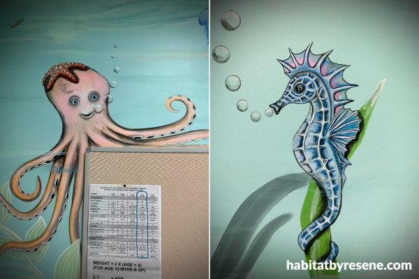 Dannika’s beautiful murals now take centre stage as a distraction from the daunting hospital equipment in calming shades like Resene Home Run, Fringy Flower, Paradise, Onahau, Glorious, Princess and Azure.