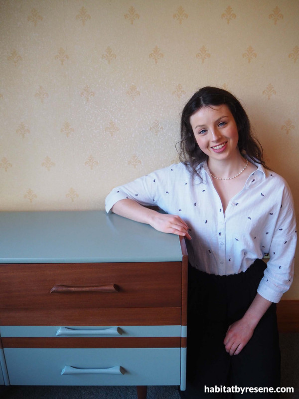Kate, pictured here with a set of upcycled drawers in Resene Blue Smoke, hopes to one day turn her passion for upcycling into a full-time job.