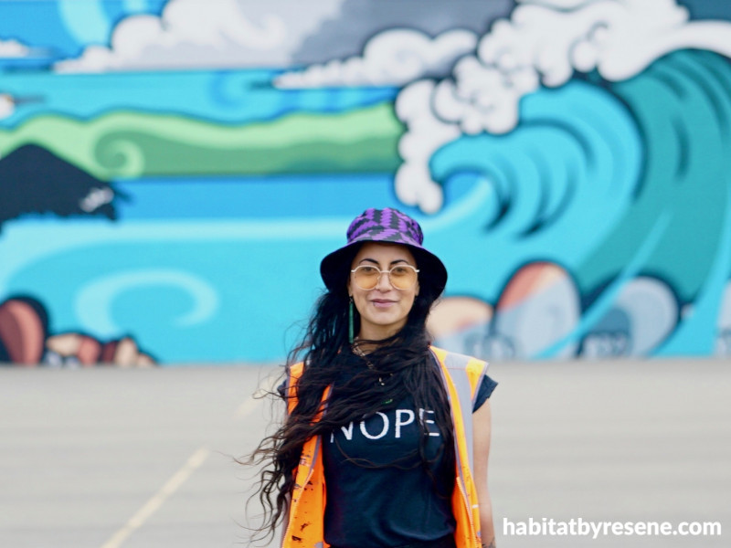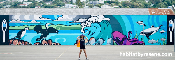 Commissioned by the Kilbirnie Business Network as part of the Kilbirnie Beautification Project, Miriama says the mural took three weeks to complete. Resene Aquarius, Resene Seeker and Resene Groovy are among the key colours featured in it.