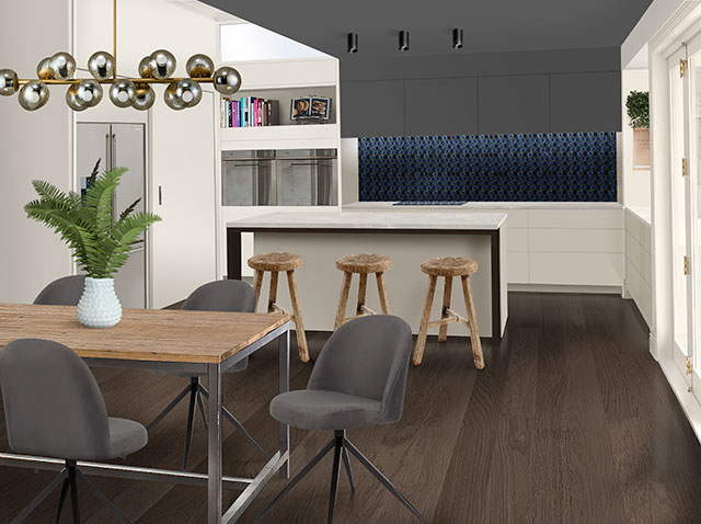 Other props: Glass Cloche Pendant Lights from Mr Ralph, Dekton by Cosentino benchtop in Aura 15, Heritage Burlington 4009 and Heritage Rewa cabinet handles 6021 from Archant, Nobilo New Road RD00137 black tapware from Burns Ferrall, a Trestle Dining Table from Corso de’Fiori, Tolix replica chairs from Cintesi and Clifton Indoor Saddle Bar Stools from Early Settler.