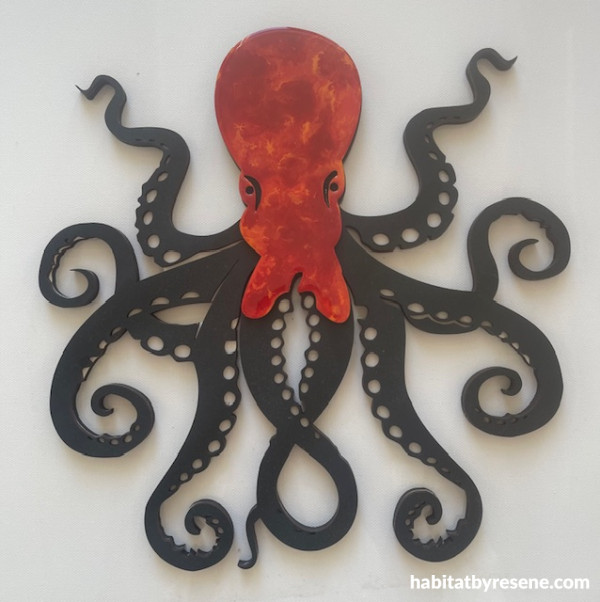 This particular artwork is of their latest ‘Kraken’ where Jan created a marbling effect using Resene Hyperactive, Resene Red Berry and Resene Guardsman Red topped with a clear resin coating. The tentacles are in a mix of Resene Black White and Resene All Black.