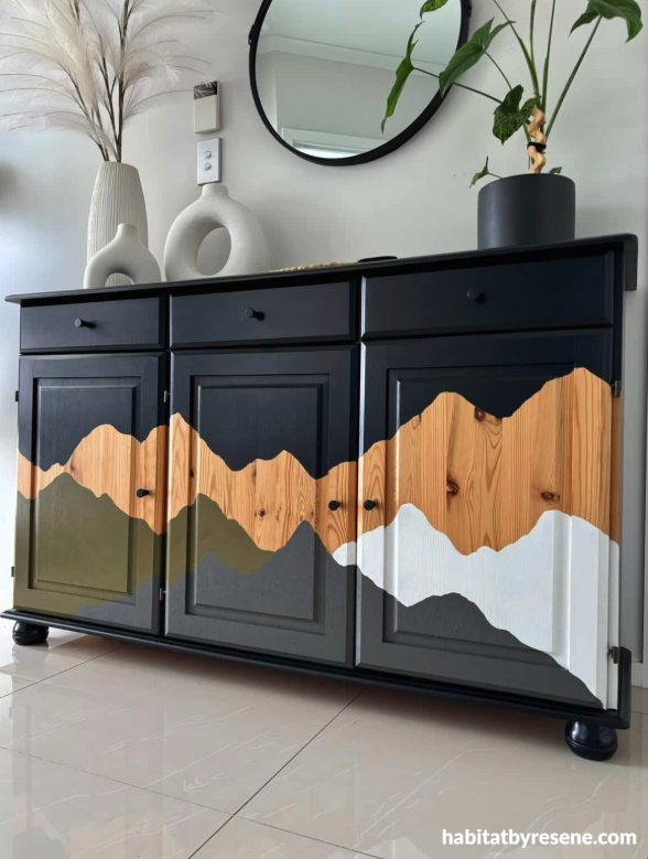 Among many other talents and creations, artist and maker, Jess, has a magic touch when it comes to upcycling furniture. “When I first came across this plain wooden buffet, I immediately saw its potential,” says Jess. “I didn’t have a set plan or design in mind, but I knew one thing for certain, it needed mountains. The mountains have always felt like home to me. I grew up surrounded by them, and to this day, they bring me a sense of calm, grounding, and peace.