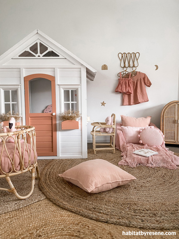 “I had a vision for Arlo’s play area that I wanted peach and pink tones,” says Hayley. “Resene Just Dance, which I painted the playhouse with, was the perfect peach to complement the pink-and-rattan piece.”