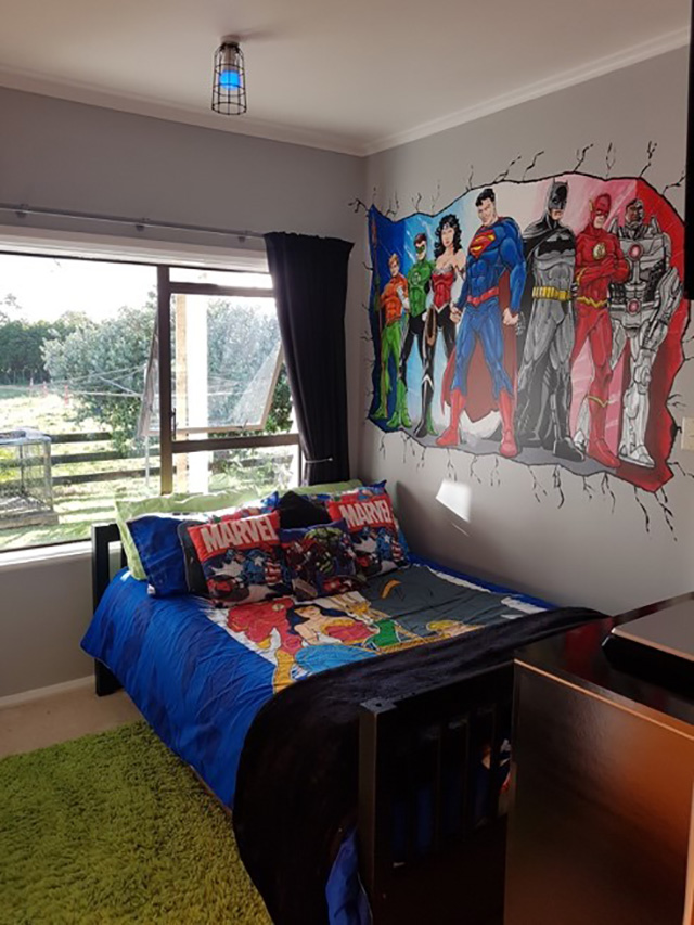 Illustrator Robert Barnes has a seriously lucky son. His dad painted this incredible Marvel mural in his room using Resene paints. Fittingly enough, the wall behind it is painted Resene Surrender.