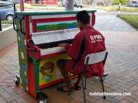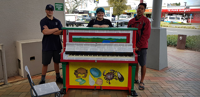 Taka, Josephine and Rico worked together to design and decorate the Te Puke Library Community piano.