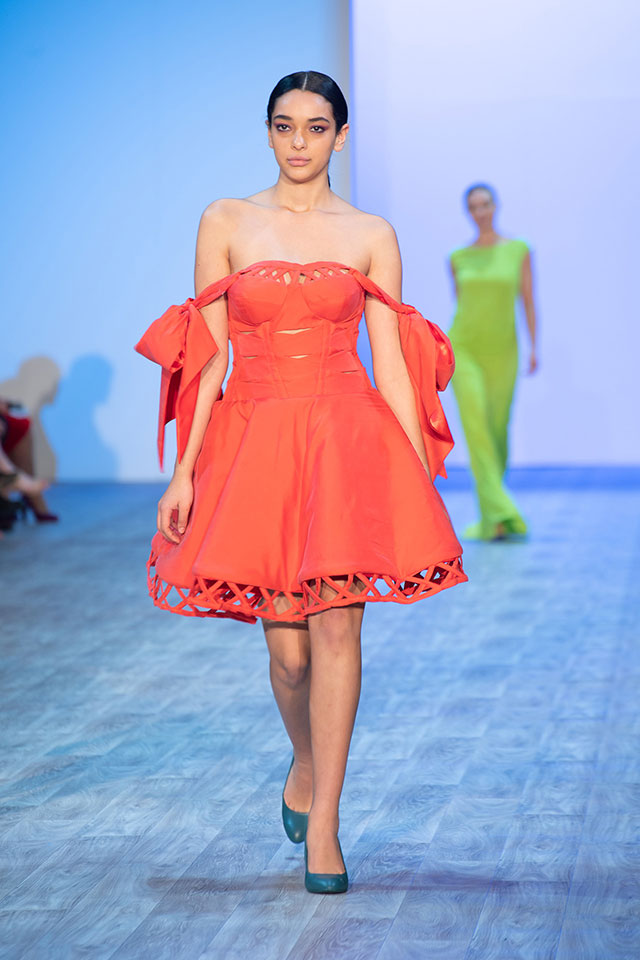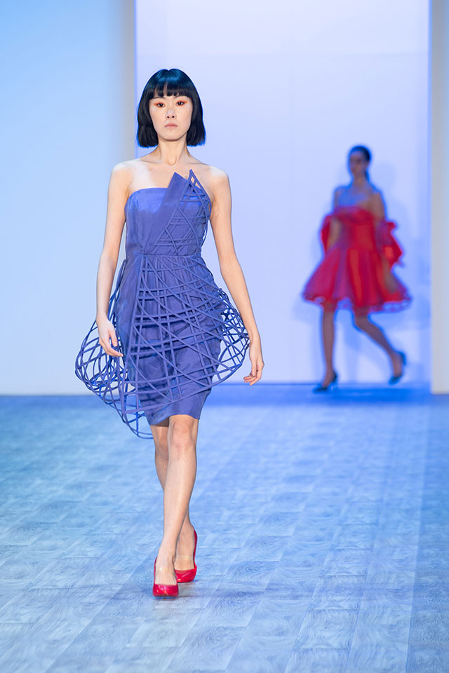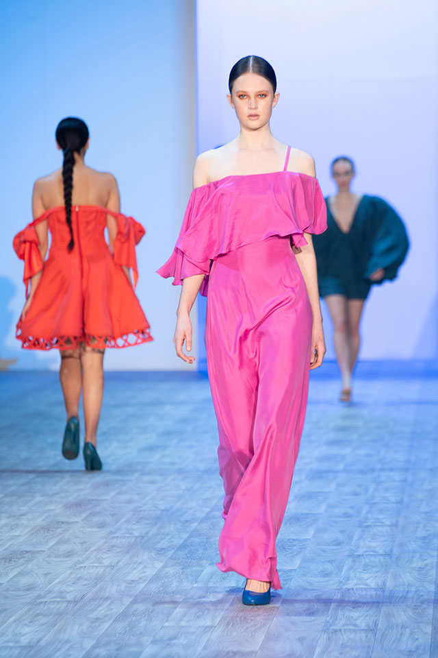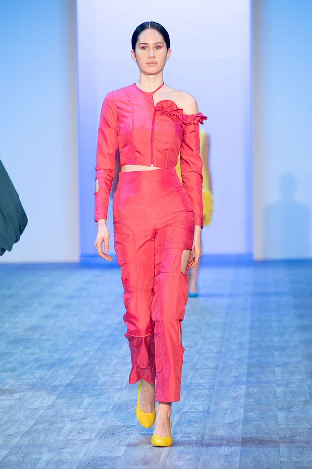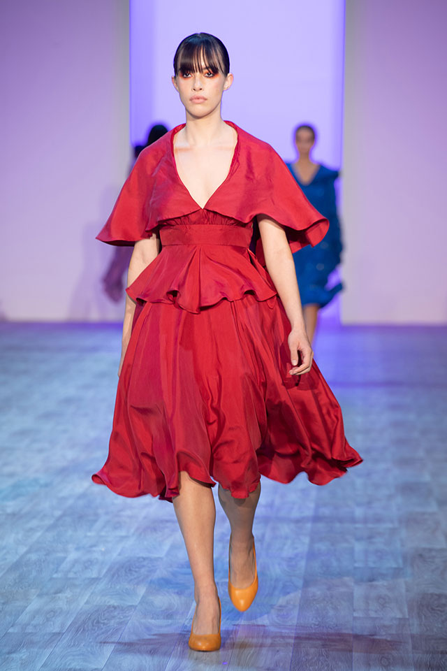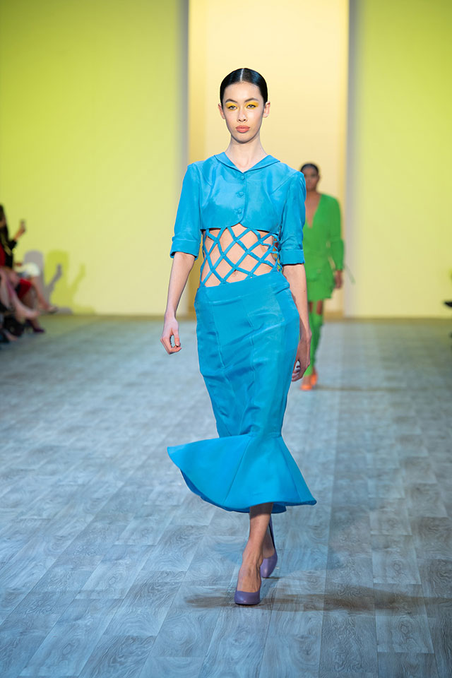 Bryony Acraman’s architectural garment opened the show with head-turning mesh features that created an accentuated silhouette. The dress is coloured in Resene Valour, which looks lovely with soft greens, blackened whites or soft yellows. Try it with Resene Aura, Resene Alabaster or Resene Moonlight.
