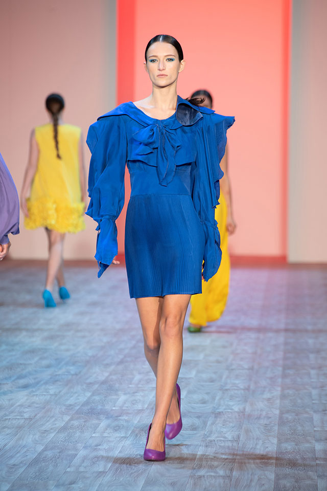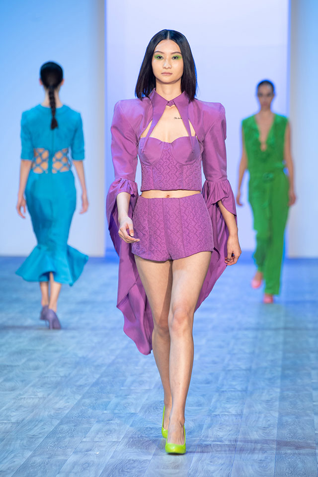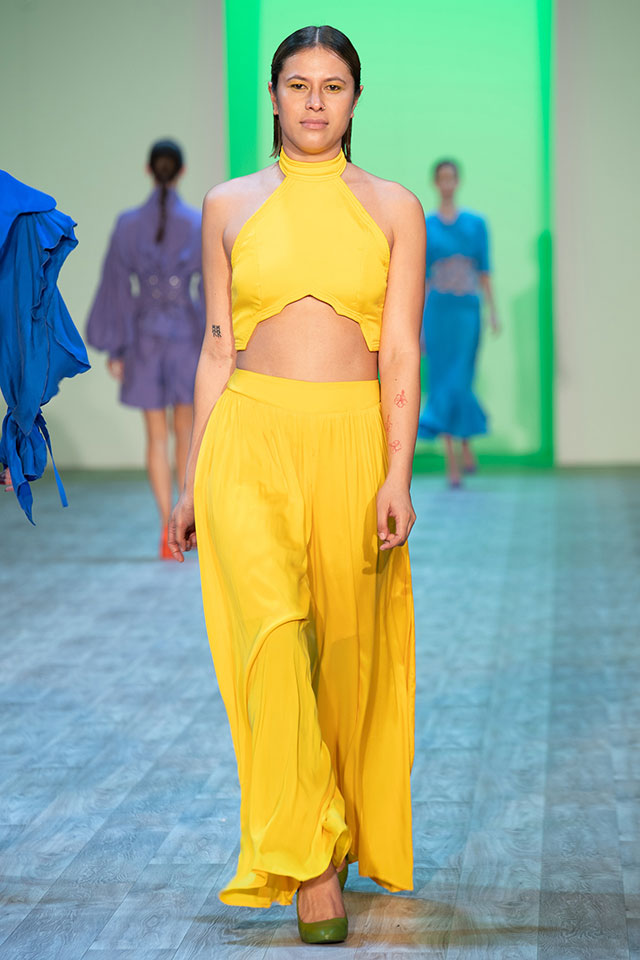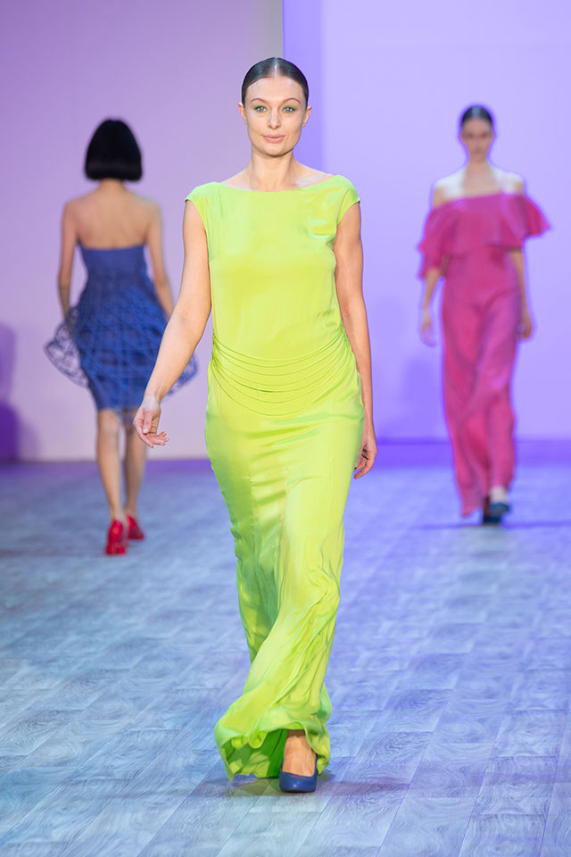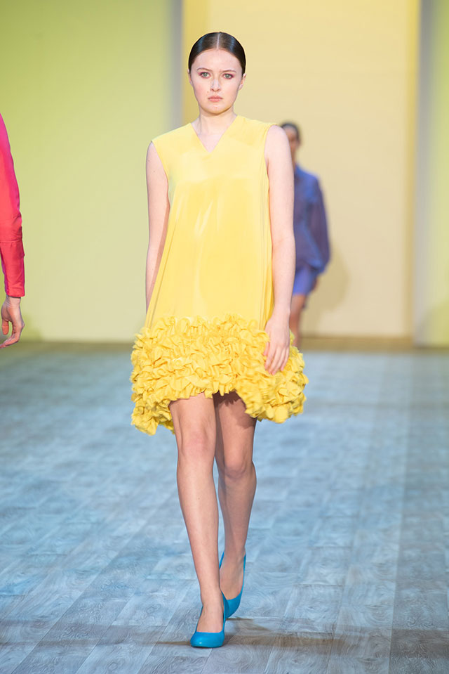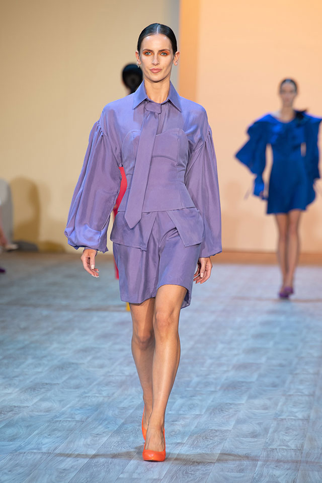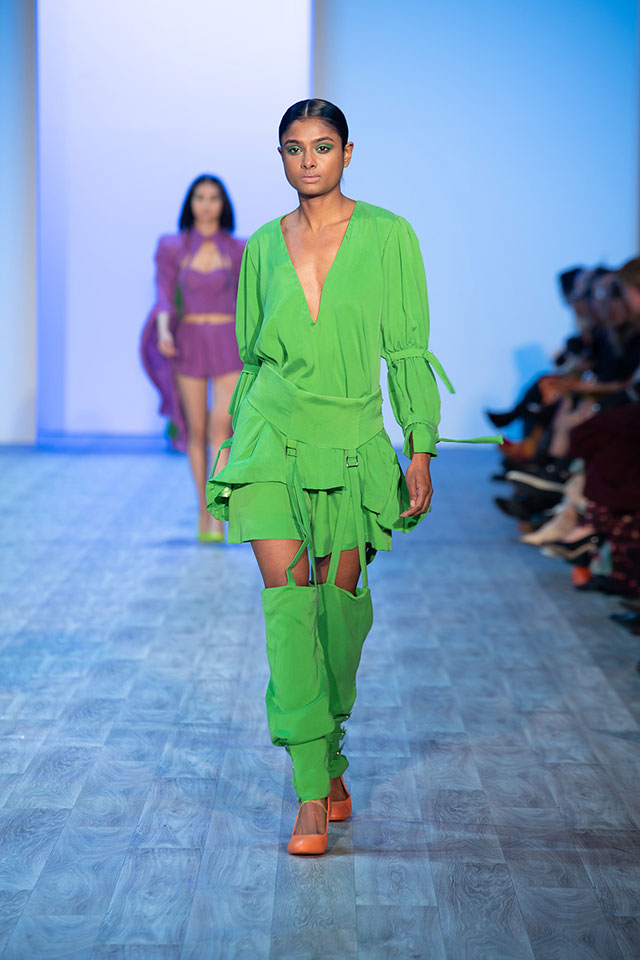 Bryony Acraman’s architectural garment opened the show with head-turning mesh features that created an accentuated silhouette. The dress is coloured in Resene Valour, which looks lovely with soft greens, blackened whites or soft yellows. Try it with Resene Aura, Resene Alabaster or Resene Moonlight.