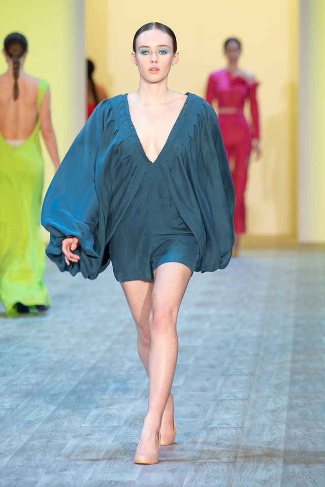 Puffed sleeves and a plunging v-neck punctuate this design by Michelle Israelson, coloured in Resene Fast Forward. Complement its moody undertone with sharp yellow whites, yellow greens or blue-greys such as Resene Rice Cake, Resene Green Smoke or Resene Raindance.