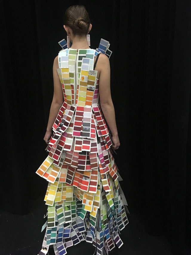 Sarah McDougall, Aria Lyver and Caitlin Watson – who are all in Year 9 at Lincoln High School – designed and constructed a colourful garment out of Resene paint swatches during their school’s Wearable Arts Club meet-ups, which take place during one lunch hour per week. According to their teacher, Emma-Jane Paterson, they made the underskirt themselves, learning new sewing skills along the way, then stitched and hot glued the Resene swatches onto the dress and skirt.