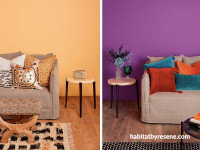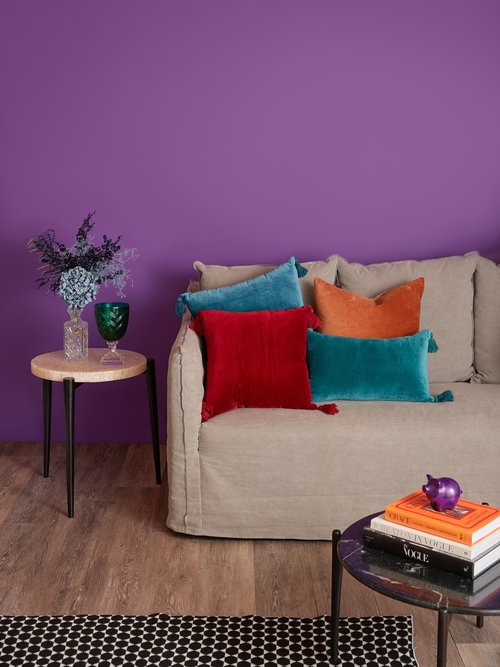 Purple is the colour of the moment and makes a bold statement, as you can see in this living room painted in Resene Boogie Wonderland. Go bold with other accessories in jewel tones, such as emerald, turquoise and orange. The flooring is Scandia Ringsted vinyl planks from Carpet Court.
